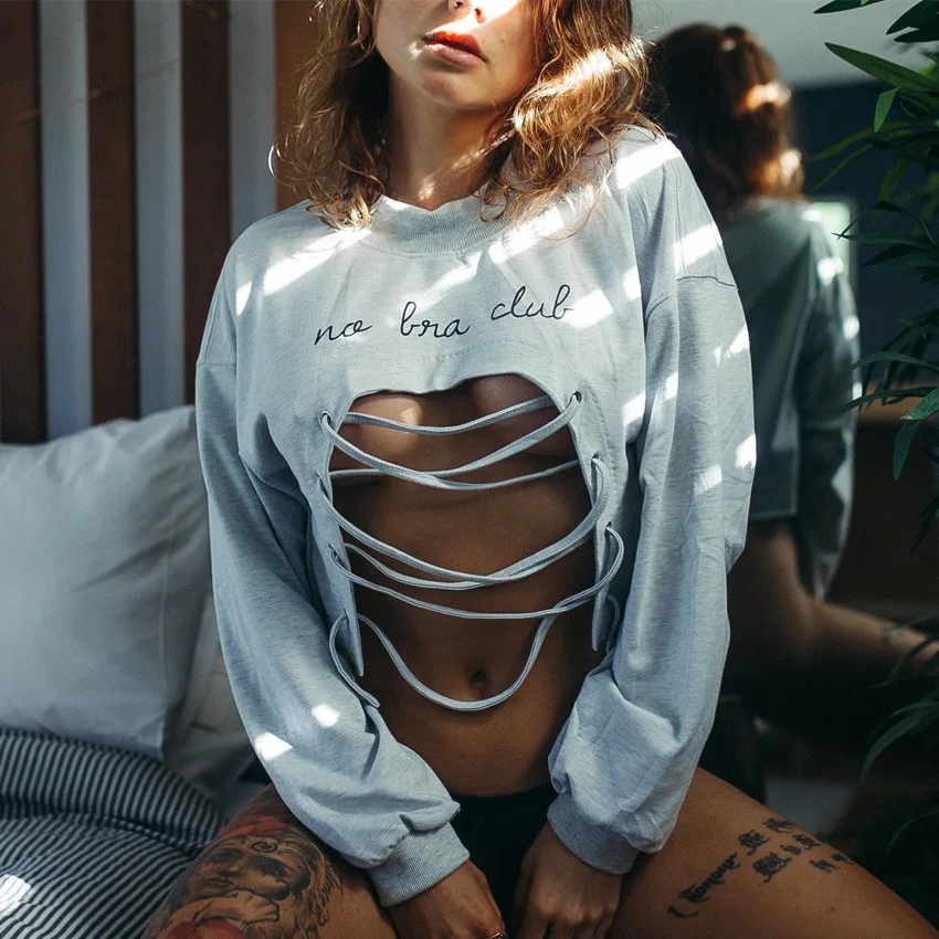 No Bra Club Letter Printed Women Long Sleeve Crop Top Sexy Lace Up Crew Neck Sweatshirt Crew Neck Sweatshirts Sweatshirt Sweatshirtcrew Sweatshirt Aliexpress